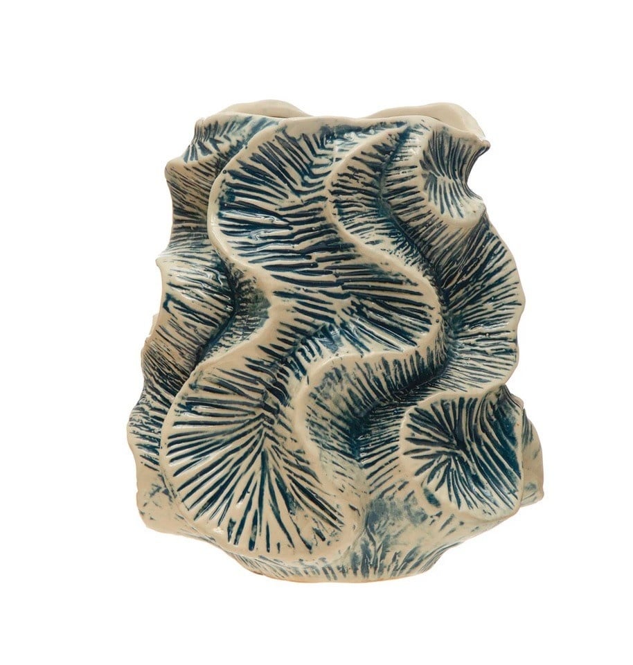 This blue and ivory stoneware vase with a wavy pattern is a stunning piece of décor that will enhance the look and feel of the home. The vase has a blue and ivory color scheme that is soothing and refreshing, creating a contrast with the wavy pattern.